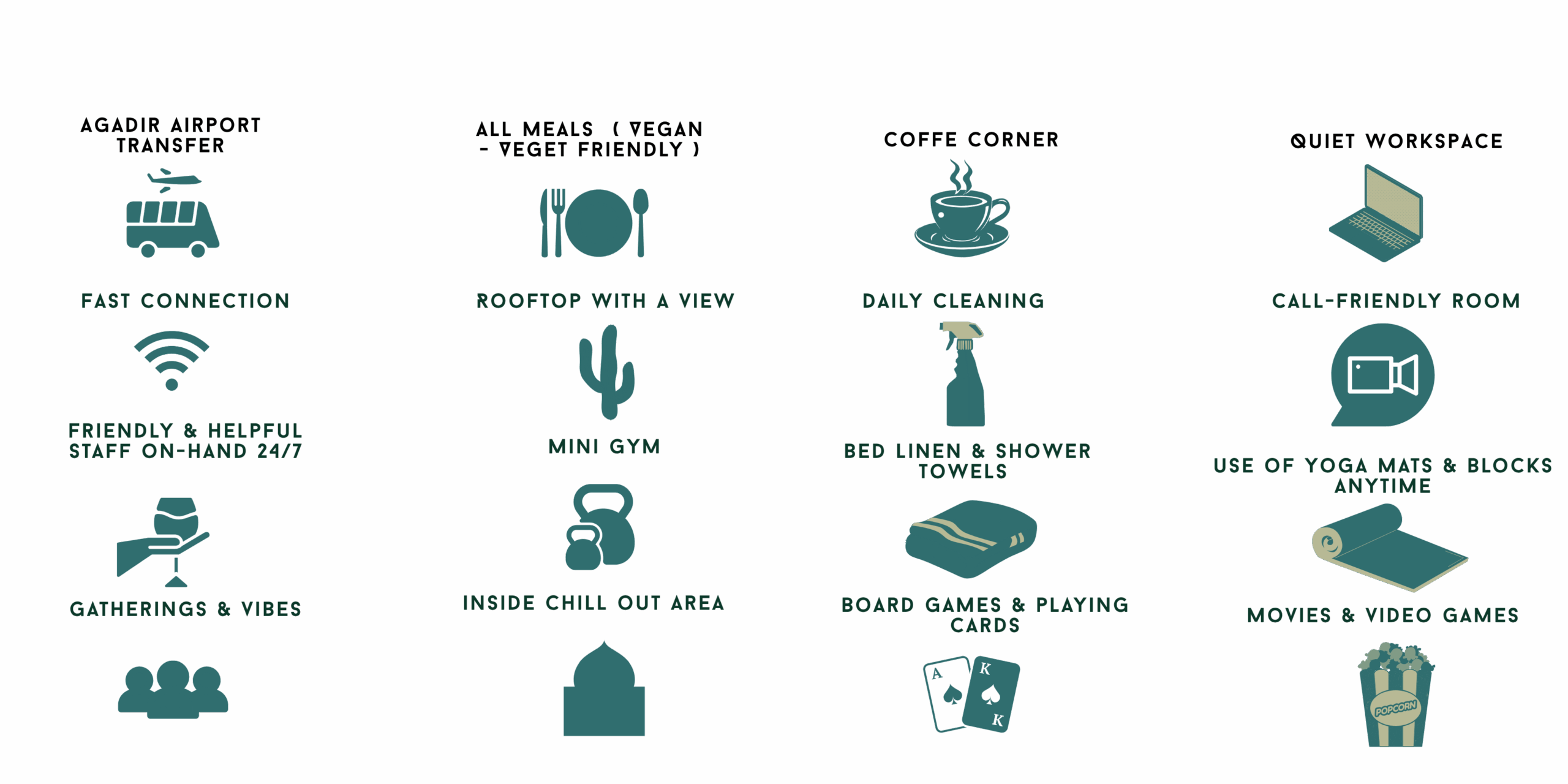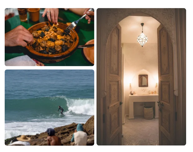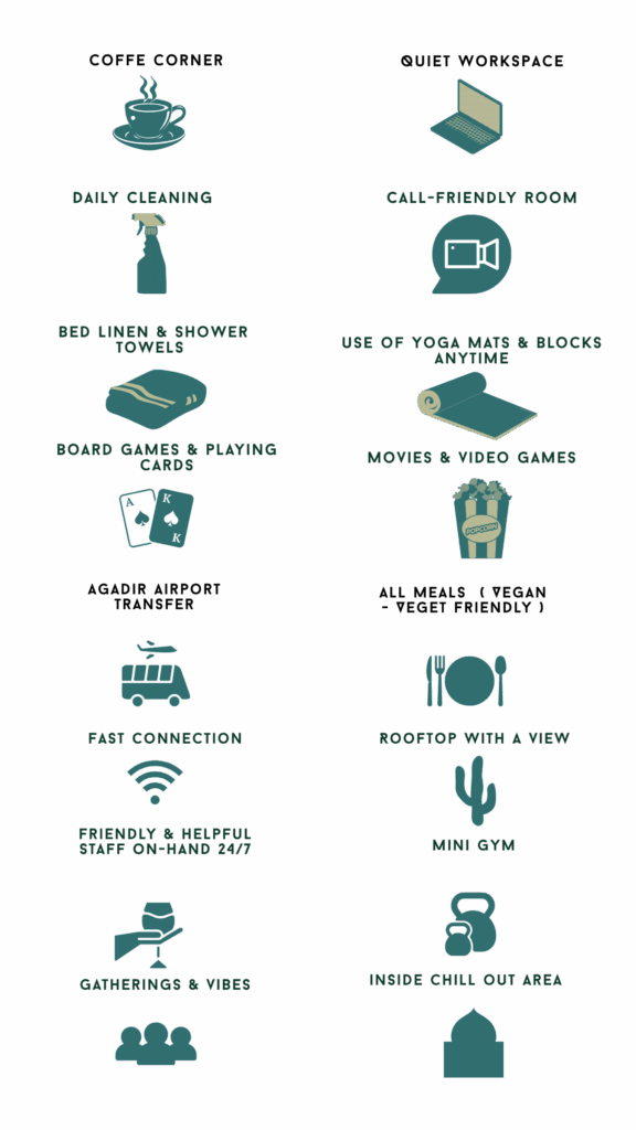 We’re just a short drive from Agadir and minutes from Taghazout’s famous surf spots. Here, mornings start with the sound of the ocean, days are filled with good waves and better people, and evenings slow down under Moroccan sunsets. Whether you surf, chill, or just need a break — this is your place.